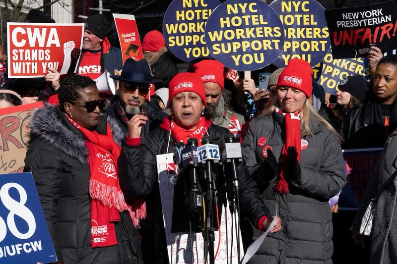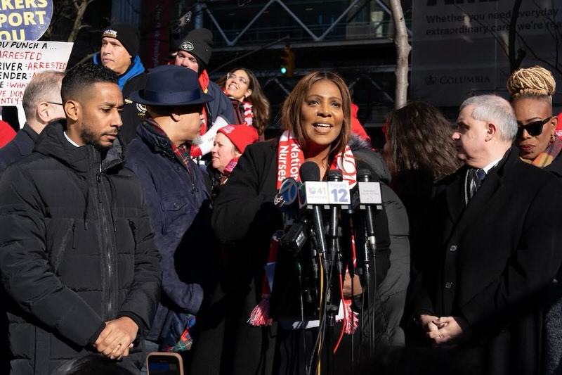 New York City Mayor Zohran Mamdani, and Attorney General of New York Letitia James joined striking nurses outside NewYork-Presbyterian in Washington Heights | Image Source: NYSNA