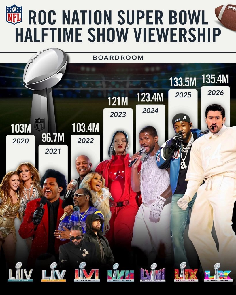 Global megastar Bad Bunny, 31, headlined the Apple Music Super Bowl LX Halftime Show on Sunday, Feb. 8, as he turned Levi’s Stadium in Santa Clara into a historic cultural stage and delivered a record-breaking performance to 135.4 million viewers that celebrated Puerto Rican and Latin identity in one of the world’s largest live entertainment stages.
